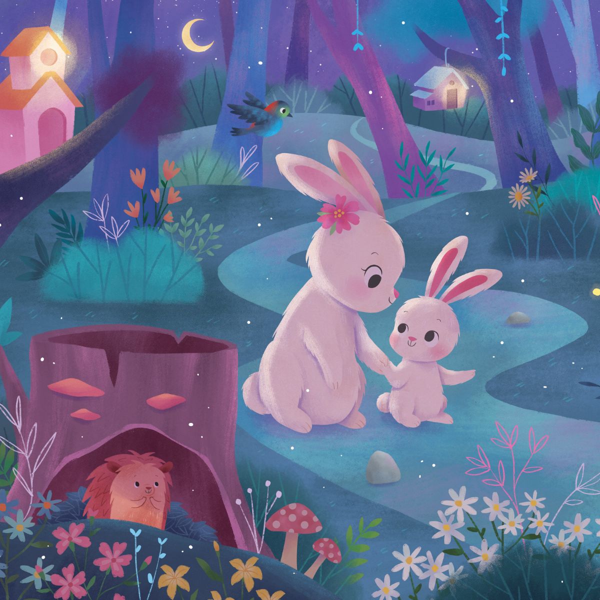 Khi màn đêm buông xuống, ánh trăng tròn tỏa sáng khắp nơi, Thỏ Con chuẩn bị đi ngủ bên vòng tay ấm áp của Thỏ Mẹ.