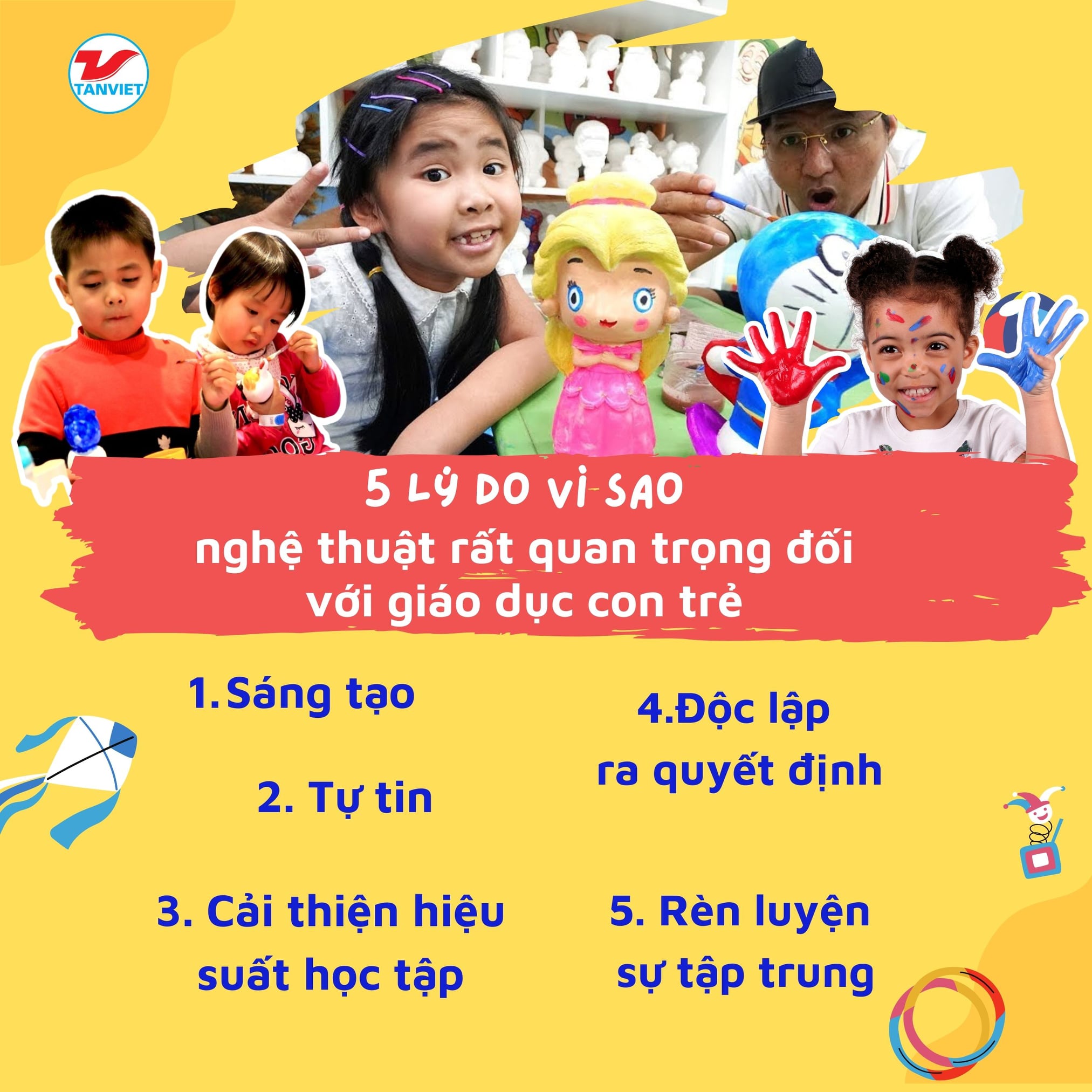 1.Sáng tạo: Nghệ thuật cho phép trẻ thể hiện bản thân tốt hơn môn toán hoặc khoa học. Nếu như con có thể thực hành suy nghĩ một cách sáng tạo theo những cách khác nhau, những điều mới mẻ sẽ tự nhiên đến với chúng ngay bây giờ thậm chí là sự nghiệp trong tương lai.
