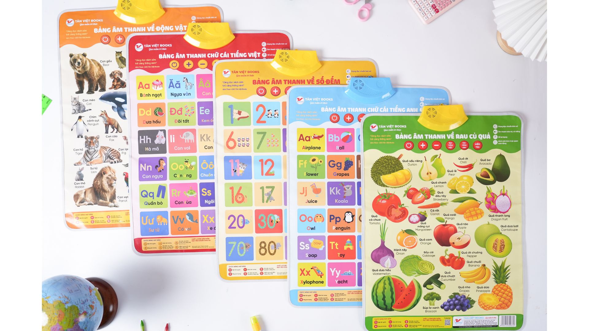 Bảng âm thanh là bộ sản phẩm công nghệ giáo dục được Tân Việt Books phát hành vào tháng 6/2024, đúng dịp nghỉ hè của các em học sinh mầm non và tiểu học. Bộ sản phẩm thú vị này bao gồm 5 bảng với 5 chủ đề quen thuộc, thiết thực cho bé như: Bảng chữ cái tiếng Anh, Bảng chữ cái tiếng Việt, Bảng số đếm, Bảng Động vật và Bảng Rau củ quả.