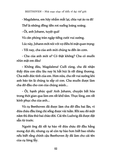 Cuốn sách Beethoven - Nhà soạn nhạc cổ điển vĩ đại thế giới gồm các câu chuyện về tuổi thơ, những năm tháng trưởng thành, cùng quá trình sáng tác những kiệt tác âm nhạc bất hủ của Beethoven.