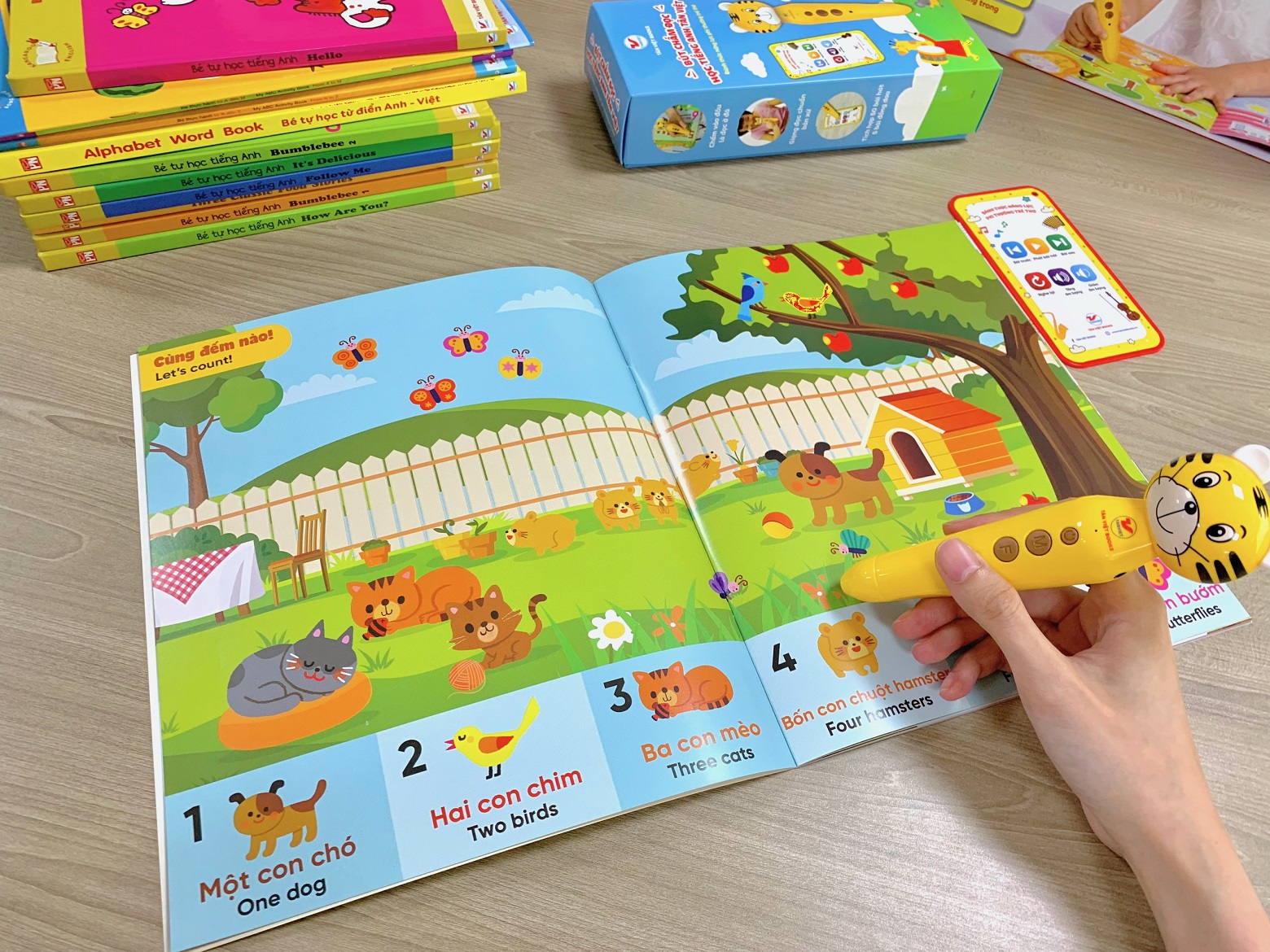Bộ sách được thiết kế gọn trong một chiếc hộp với một bút chấm đọc thông minh và 12 cuốn sách đa dạng chủ đề: Bé tự học từ và bảng chữ cái tiếng Việt; Bé tự học số đếm và hình dạng; Bé tự học tiếng Anh qua ba câu chuyện kinh điển về đồ ăn: Three classic food stories; Bé tự học tiếng Anh qua câu chuyện về ngỗng mẹ đầu tiên; Bé tự học tiếng Anh: Hello; Bé tự học tiếng Anh: How are you?; Bé tự học tiếng Anh: Follow me; Alphabet Word book; Bumblebee 1 và 2; Bé thực hành từ A đến M: My ABC Activity Book; Bé thực hành từ N đến Z: My ABC Activity Book.