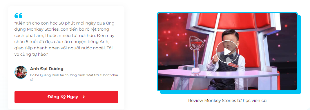 "Kiên trì cho con học 30 phút mỗi ngày qua ứng dụng Monkey Stories, con tiến bộ rõ rệt trong cách phát âm, thuộc nhiều từ mới hơn. Đến nay cháu 5 tuổi đã đọc các câu chuyện tiếng Anh, giao tiếp nhanh nhẹn với người nước ngoài. Tôi vô cùng tự hào." - Một chia sẻ khác đến từ anh Đại Dương, bố của bé Quang Bình tại chương trình "Mặt trời tí hon" khi nhắc đến Monkey Stories.