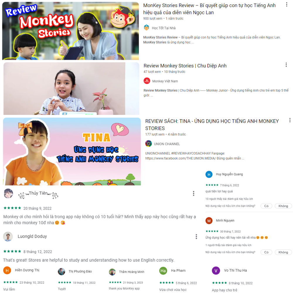 Hơn thế nữa, nhiều phụ huynh đã tin tưởng lựa chọn Monkey Stories cho con em mình và gặt hái được những kết quả tích cực, minh chứng là các review trải dài trên Facebook, Youtube,... mà bạn có thể tìm kiếm nhanh chóng bằng cụm từ “Monkey Stories review”, cũng như phần chia sẻ trải nghiệm thực tế trên các kho ứng dụng như CH Play và App Store.