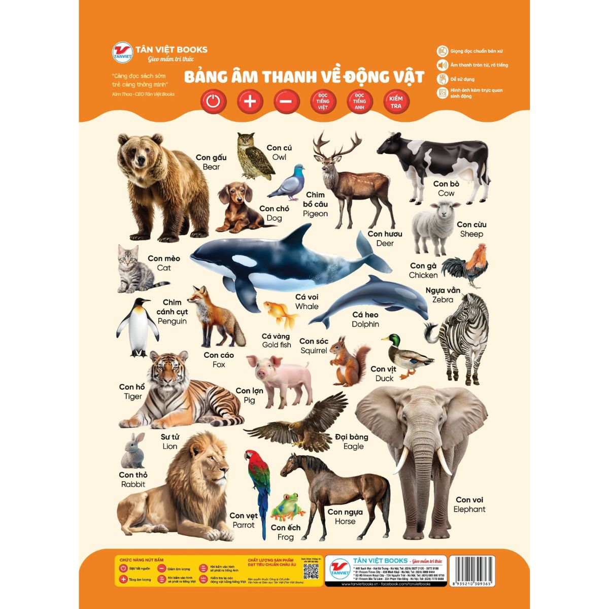 Bảng động vật – 26 loài vật, có cả tiếng kêu thật giúp bé nhận biết và ghi nhớ lâu hơn.