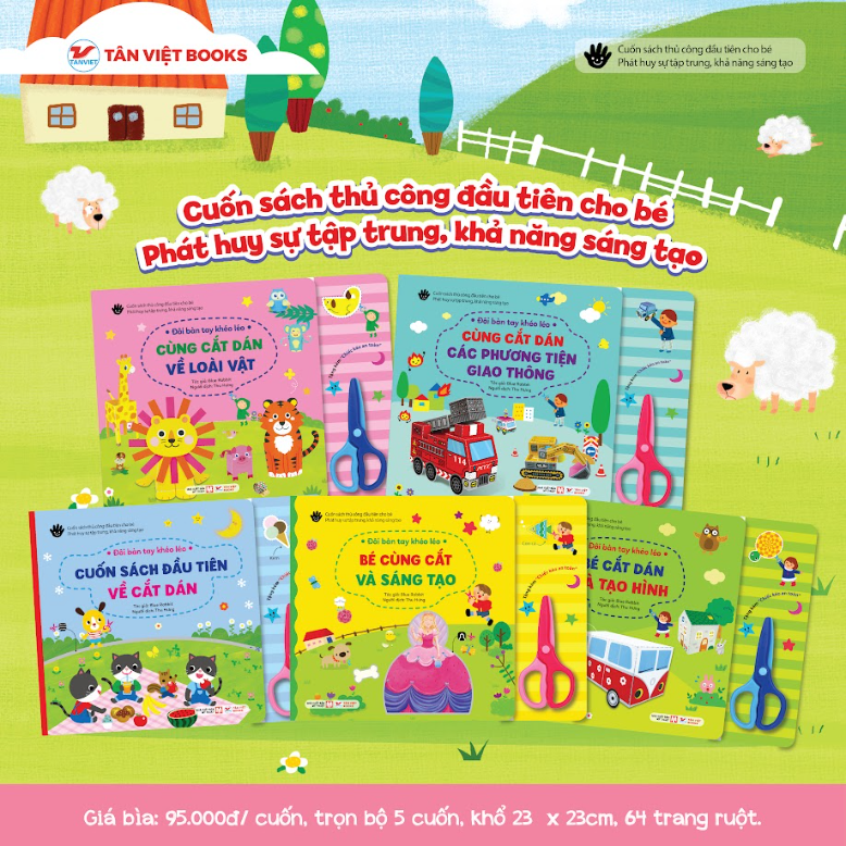 Điểm đặc biệt của bộ sách là kéo an toàn được tặng kèm, giúp trẻ cắt giấy dễ dàng mà không gây nguy hiểm. Thiết kế minh họa bắt mắt, màu sắc tươi sáng khơi gợi trí tò mò, đồng thời hướng dẫn từng bước để trẻ hoàn thiện các sản phẩm thủ công như thú cưng, ô tô, tàu biển, hoa lá, khung ảnh…