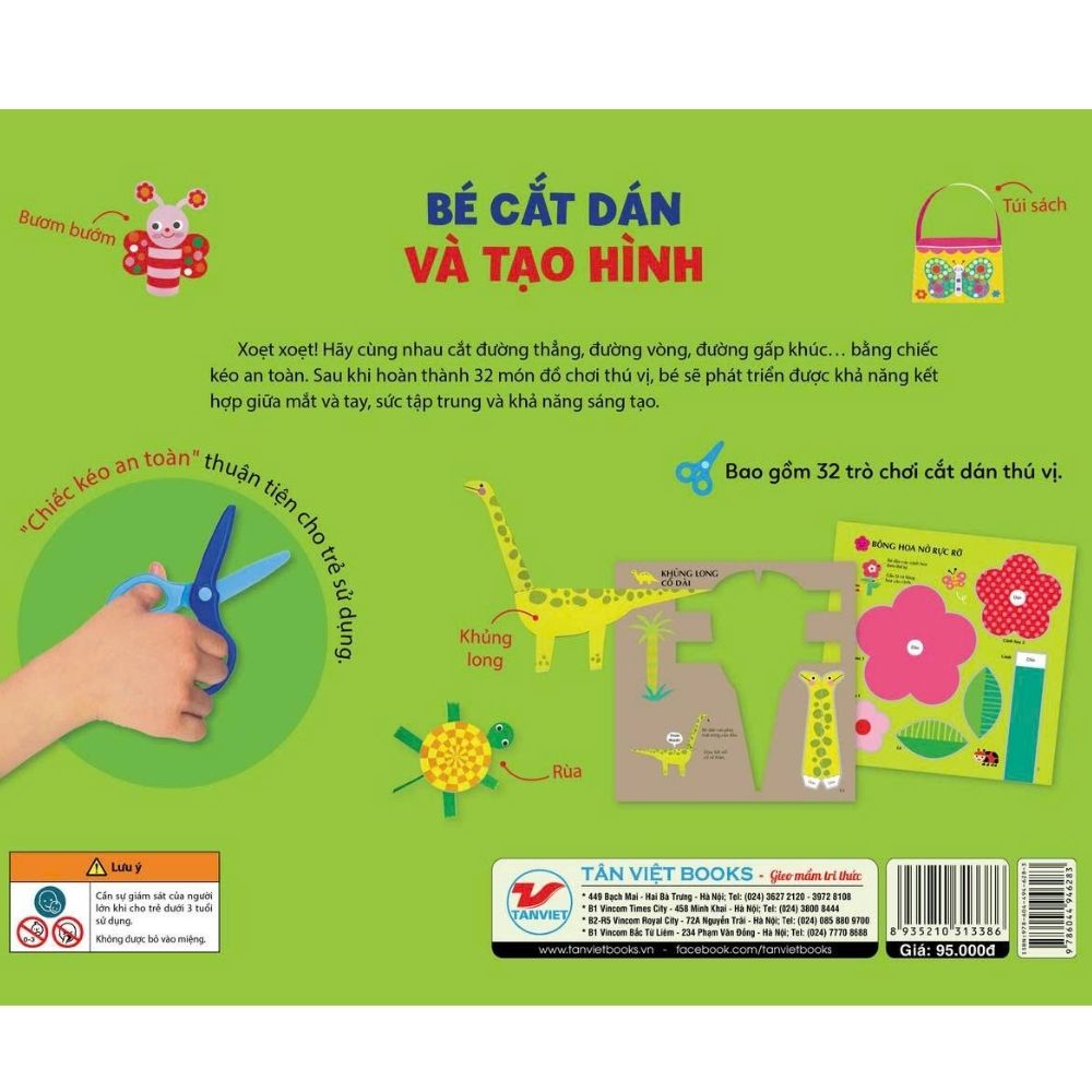 Điểm đặc biệt của bộ sách là kéo an toàn được tặng kèm, giúp trẻ cắt giấy dễ dàng mà không gây nguy hiểm. Thiết kế minh họa bắt mắt, màu sắc tươi sáng khơi gợi trí tò mò, đồng thời hướng dẫn từng bước để trẻ hoàn thiện các sản phẩm thủ công như thú cưng, ô tô, tàu biển, hoa lá, khung ảnh…