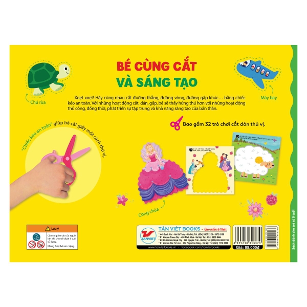 Điểm đặc biệt của bộ sách là kéo an toàn được tặng kèm, giúp trẻ cắt giấy dễ dàng mà không gây nguy hiểm. Thiết kế minh họa bắt mắt, màu sắc tươi sáng khơi gợi trí tò mò, đồng thời hướng dẫn từng bước để trẻ hoàn thiện các sản phẩm thủ công như thú cưng, ô tô, tàu biển, hoa lá, khung ảnh…
