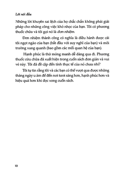 Trong cuốn sách Đơn Nhiệm - Làm Từng Việc Một Để Kết Quả Tốt Nhất, tác giả Devora Zack đưa ra những bằng chứng khoa học để chứng minh rằng “làm càng nhiều sẽ giải quyết được càng nhiều việc” là quan điểm hoàn toàn sai, mà có một phương pháp khác hiệu quả hơn để đối phó vói hàng tá công việc trút xuống đầu chúng ta mỗi ngày. Đó chính là đơn nhiệm. Đơn nhiệm sẽ giúp bạn luôn luôn tỉnh táo và sáng suốt, biết cách sắp xếp lịch làm việc và môi trưòng làm việc, biết xử lý các tình huống và vấn đề một cách linh hoạt để bạn có thể hoàn thành tốt những nhiệm vụ được giao một cách tuần tự, mỗi lúc một việc, mà vẫn đạt được hiệu quả tối ưu. Đơn nhiệm chính là chìa khóa đưa bạn đến với thành công trong công việc và cuộc sống.