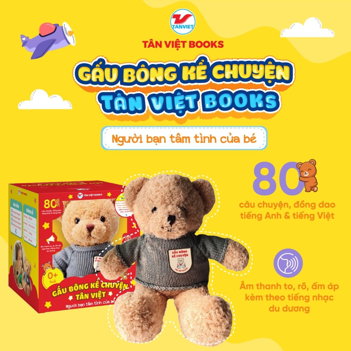 "Gấu Bông Kể Chuyện Tân Việt Books" gồm 80 nội dung (20 câu chuyện tiếng Anh, 20 câu chuyện tiếng Việt, 20 bài đồng dao tiếng Anh, 20 bài đồng dao tiếng Việt), sẽ là giải pháp để: