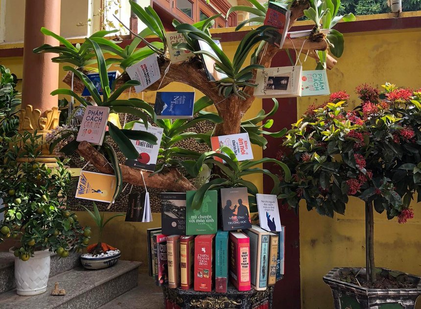 Những ngày cuối năm, độc giả có tài khoản mạng xã hội Binh Karatedo chia sẻ hình ảnh “cây tài lộc” và nhận được sự hưởng ứng từ người yêu sách. Thay bằng phong bao lì xì đỏ, độc giả này đã trang trí chậu cây nhà mình bằng cách treo các cuốn sách yêu thích.