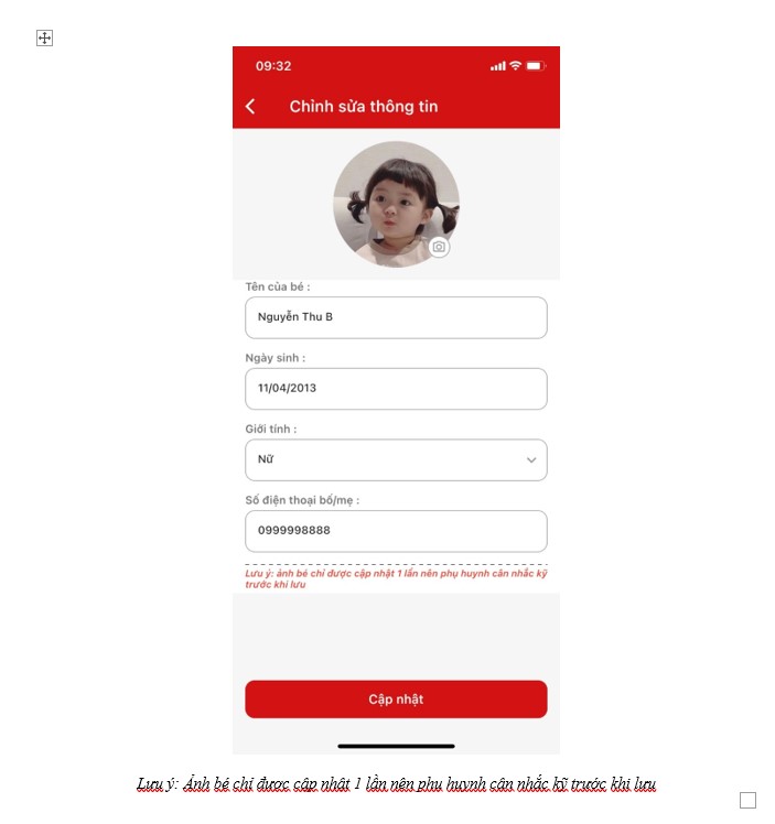 (Lưu ý: Ảnh bé chỉ được cập nhật 1 lần nên phụ huynh cân nhắc kỹ trước khi lưu):