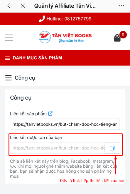 Hệ thống sẽ trả cho bạn link tiếp thị liên kết của sản phẩm đó (Link có chứa mã CTV của bạn)