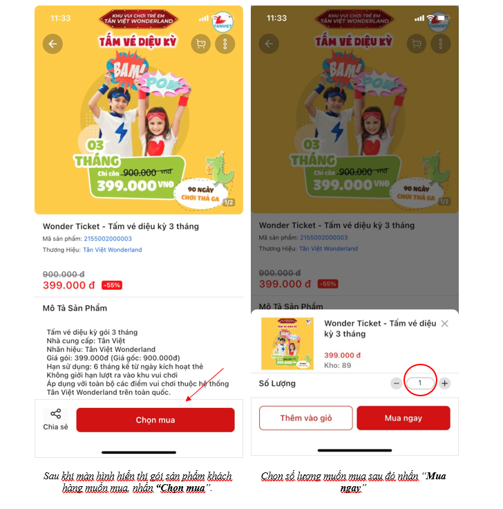 Bước 4: Sau khi màn hình hiển thị gói sản phẩm khách hàng muốn mua, nhấn “Chọn mua”. Chọn số lượng muốn mua sau đó nhấn “Mua ngay”: