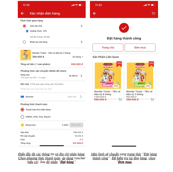 Bước 5: Điền đầy đủ các thông tin và đia chỉ nhận hàng. Chọn phương thức thanh toán, áp dụng voucher (nếu có). Sau đó nhấn “Đặt hàng”. Màn hình sẽ chuyển sang trạng thái “Đặt hàng thành công”. Để kiểm tra lại đơn hàng, chọn “Đơn mua”: