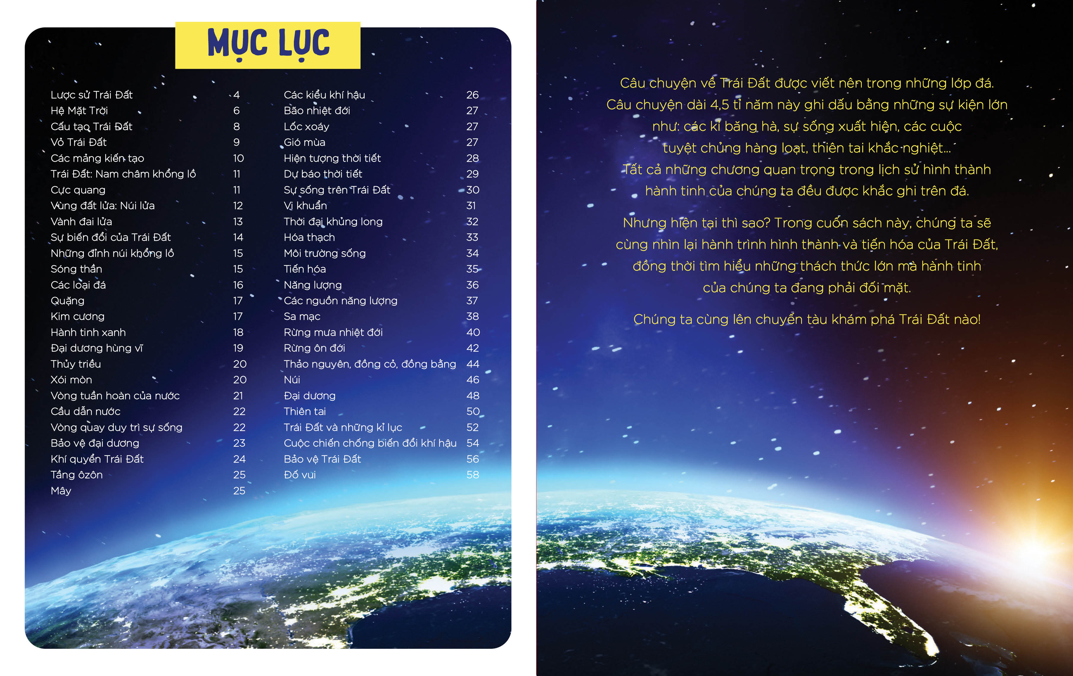 - Theo đó, tác giả giới thiệu rõ hơn về cấu tạo của Trái Đất, các sự kiện diễn ra làm thay đổi địa hình của hành tinh xanh, sự tiến hóa của các loài, thời đại khủng long, các quần xã sinh học mà hành tinh xanh hiện có, các kiểu thời tiết, vòng tuần hoàn của nước,…