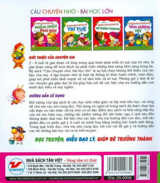 3-6 tuổi là giai đoạn vỡ lòng trong quá trình phát triển trí tuệ của trẻ nhỏ, là giai đoạn vàng để kích thích sự phát triển những khả năng tiềm tàng trong bé. Bộ sách "Câu chuyện nhỏ, bài học lớn" là sự lựa chọn không thể thiếu của các bậc cha mẹ. 4 tập truyện nhỏ là một hệ thống tri thức hoàn chỉnh, toàn diện, giúp trẻ phát triển lành mạnh cả về tâm hồn và trí tuệ. Những gợi ý tinh tế từ các chuyên gia giáo dục là trợ giúp hữu ích để các bậc cha mẹ hướng dẫn con mình đọc hiểu và suy ngẫm.