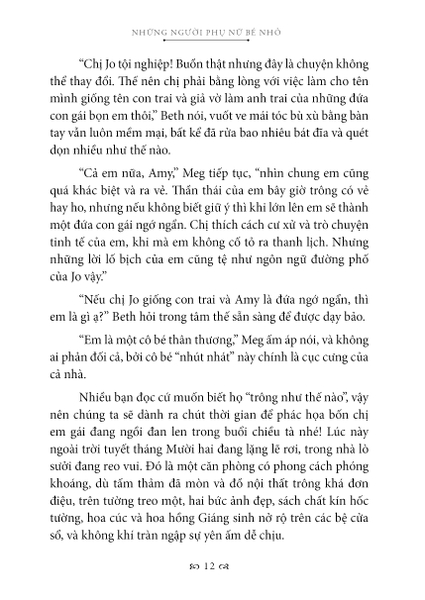 Những người phụ nữ bé nhỏ là một trong những cuốn sách văn học kinh điển hay nhất mọi thời đại, xoay quanh câu chuyện về cuộc sống của bốn chị em nhà March. Meg là cô chị cả xinh đẹp, người sẵn sàng đánh đổi sự phù phiếm để lấy người đàn ông mình yêu. Jo, cô nàng mạnh mẽ, đầy cá tính, với ước muốn trở thành một văn sĩ. Beth, luôn ngọt ngào và sẵn lòng giúp đỡ mọi người. Cuối cùng là cô út Amy tóc vàng, dễ thương như búp bê có năng khiếu đặc biệt về hội họa. Bốn chị em đã dũng cảm vượt qua đói nghèo, chiến tranh và những biến động thời đại để tìm kiếm tình yêu, công việc và hạnh phúc đích thực cho riêng mình. Trên tất cả, họ đã cùng nhau trưởng thành, cùng nhau trải qua những tranh cãi, cùng chia sẻ những khoảnh khắc đủ là hạnh phúc hay buồn đau để gìn giữ những giá trị cơ bản của một gia đình.