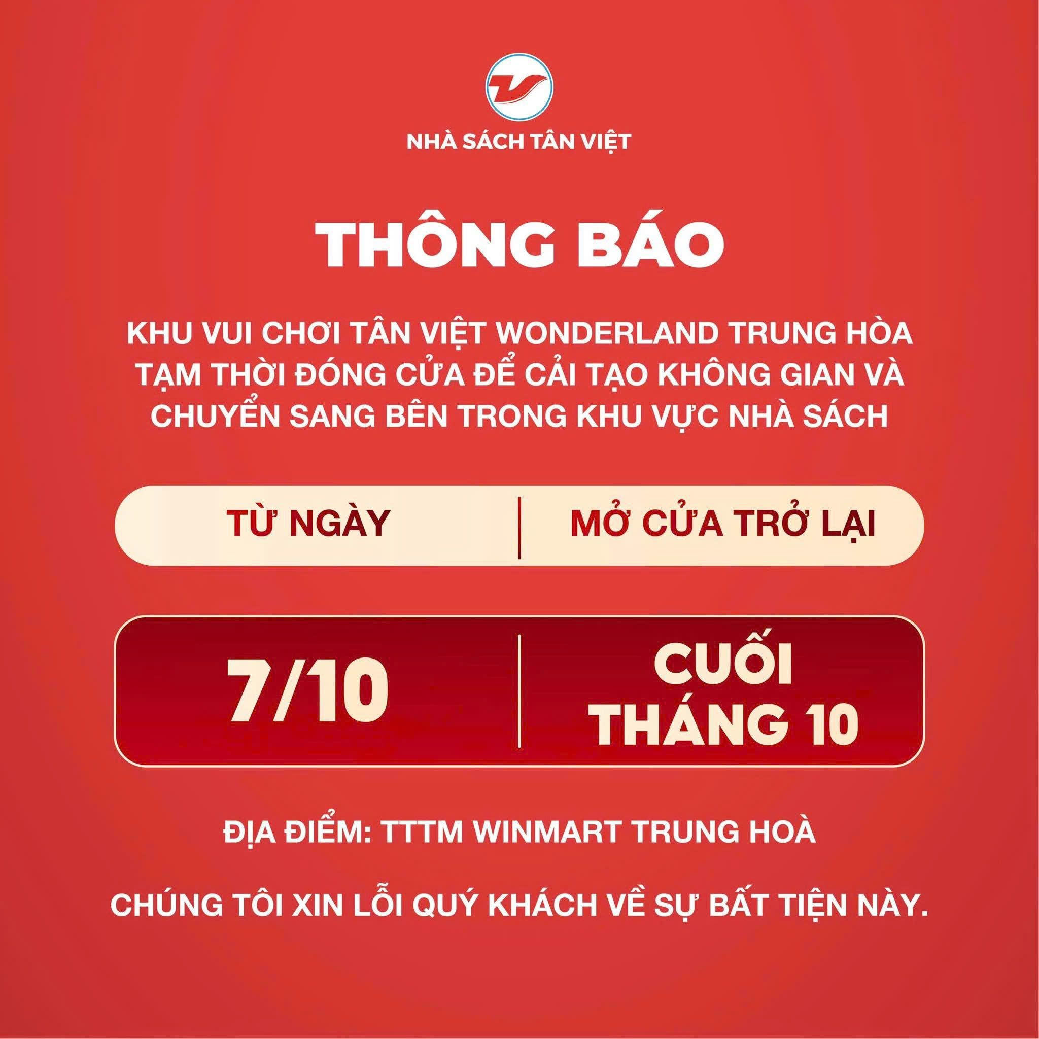 Từ ngày 07/10 đến hết tháng 10, Khu vui chơi Tân Việt Wonderland – Winmart Trung Hoà sẽ tạm dừng hoạt động để cải tạo không gian và chuyển vào bên trong khu vực Nhà sách Tân Việt.
