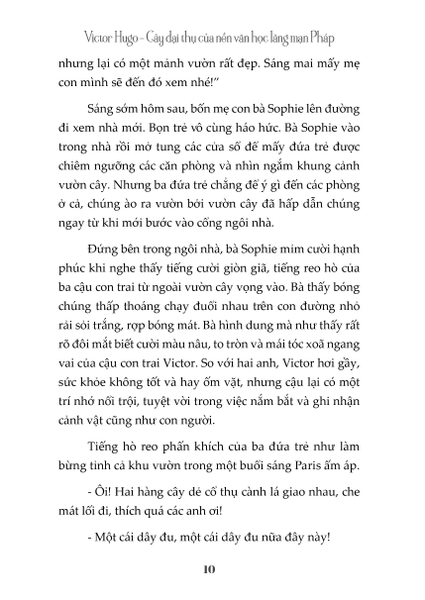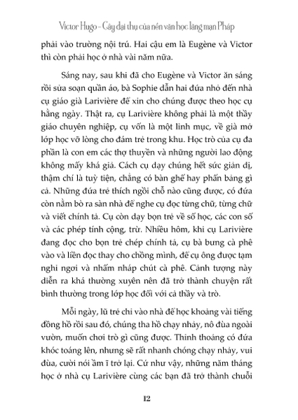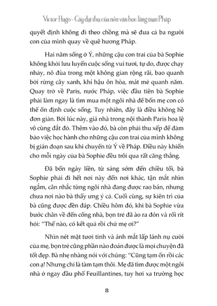 Cuốn sách Victor Hugo - Cây đại thụ của nền văn học lãng mạn Pháp viết về cuộc đời và sự nghiệp đại văn hào Victor Hugo, từ những năm tháng ấu thơ không bình lặng đến những vinh quang và cay đắng suốt 19 năm lưu vong nơi xứ người của ông. Song tất cả những sóng gió ấy đã góp phần tôi luyện và tạo nên một đại văn hào, một chính trị gia, một nhà trí thức dám dấn thân tiêu biểu của nước Pháp thế kỉ 19.